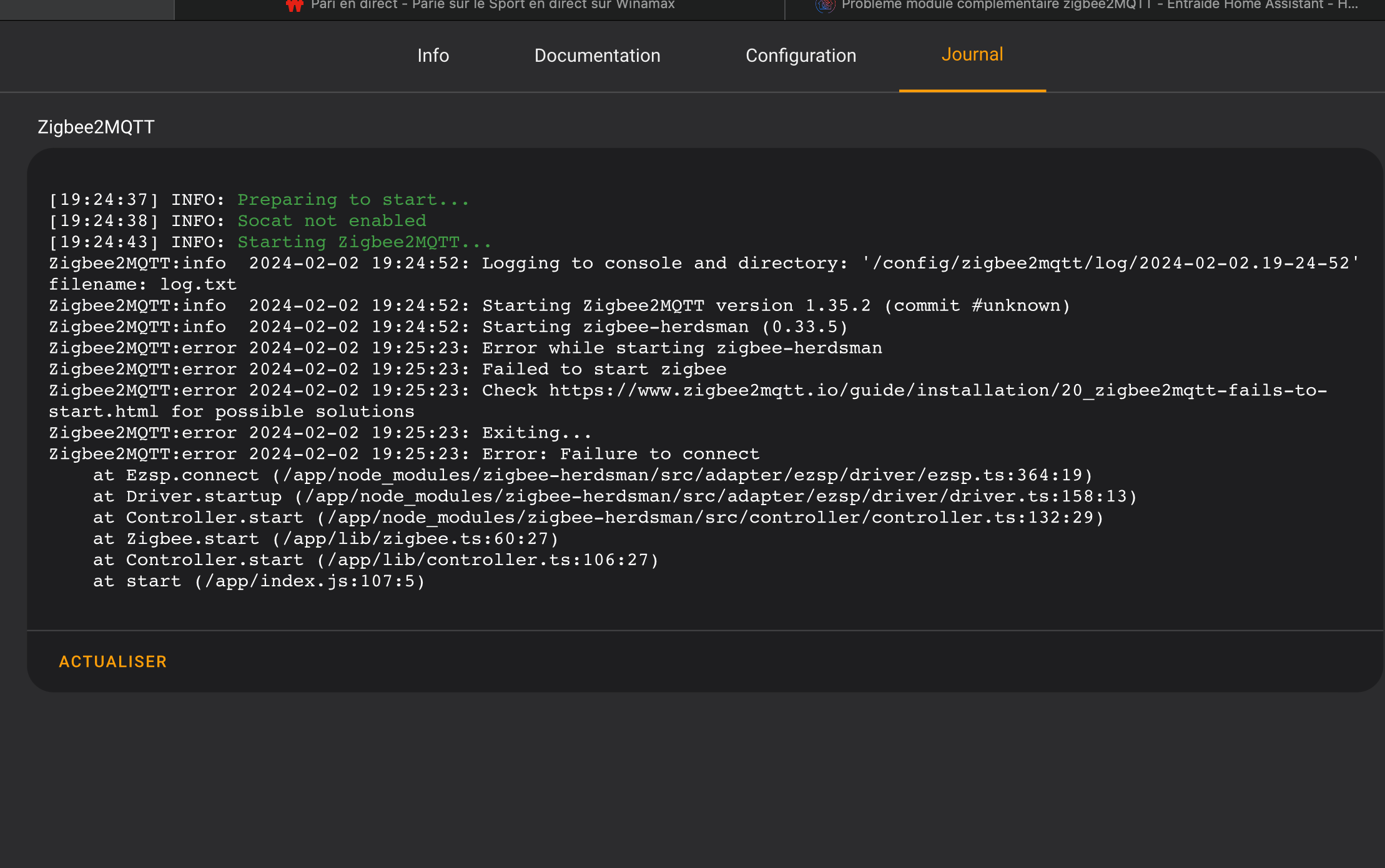 lorsque je lance Zigbee2MQTT il est marqué que le module complémentaire est arrêté ma question