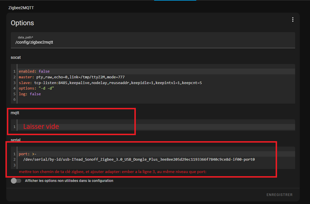 Configure zigbee2mqtt de l’UI, laisse la partie MQTT vide. Dans serial, ajoute le port avec ton chemin de la clé zigbee et adapter: ember.