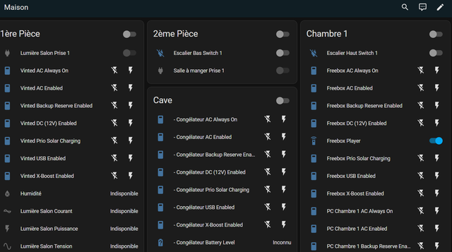 Pour le tableau de bord, oublie le dashboard par défaut qui se rempli automatiquement avec tout ce que contient HA et pars sur un dashboard vide et ajoute petit à petit les tuiles que tu veux avec uniquement les contrôles voulus.