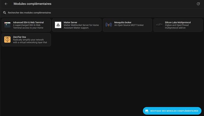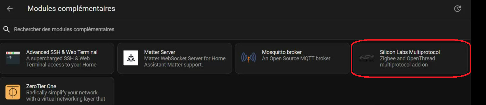 Si tu veux du pas à pas, commence par mettre une copie d’écran de tes intégrations et modules complémentaires. Si le module complémentaire Silicon Labs Multiprotocol n’est pas configuré et lancé, tu n’arriveras à rien