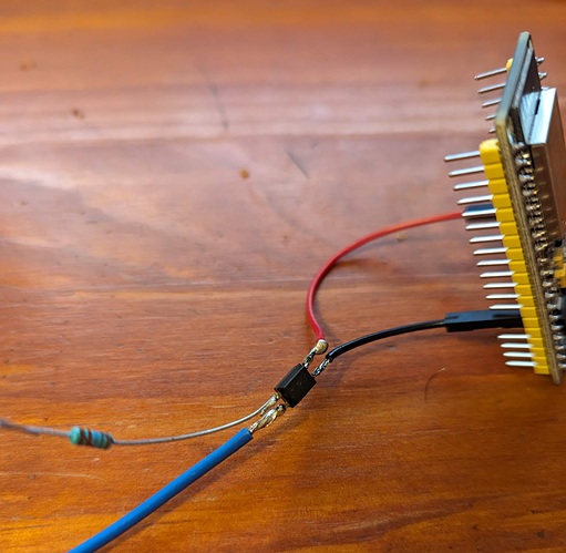 J’ai donc pris 2 résistance une de 18,7 kOhms et une de 14 kOhms en série ce qui me donne une résistance totale de 32.7 kOhms.