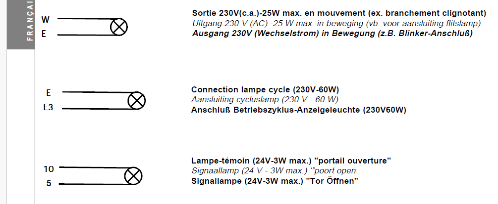 Petit bonus. Sur la doc ci dessus on voit que entre W et E on à la lumière pour le clignotant du portail. On pourrait faire de même pour avoir un capteur indiquant portail en mouvement soit avec un relais 220 V cette fois soit avec le montage proposé mais en adaptant les valeurs de résistance.