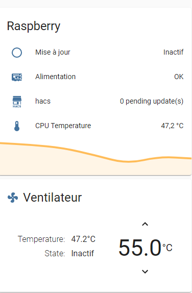 La programmation est géré par la partie « climate » tu rentre ta valeur mini (celle à partir de laquelle le ventilateur se met en route, la partie sensor ajoute ajoute un sensor de température du CPU et le switch ajoute… un switch