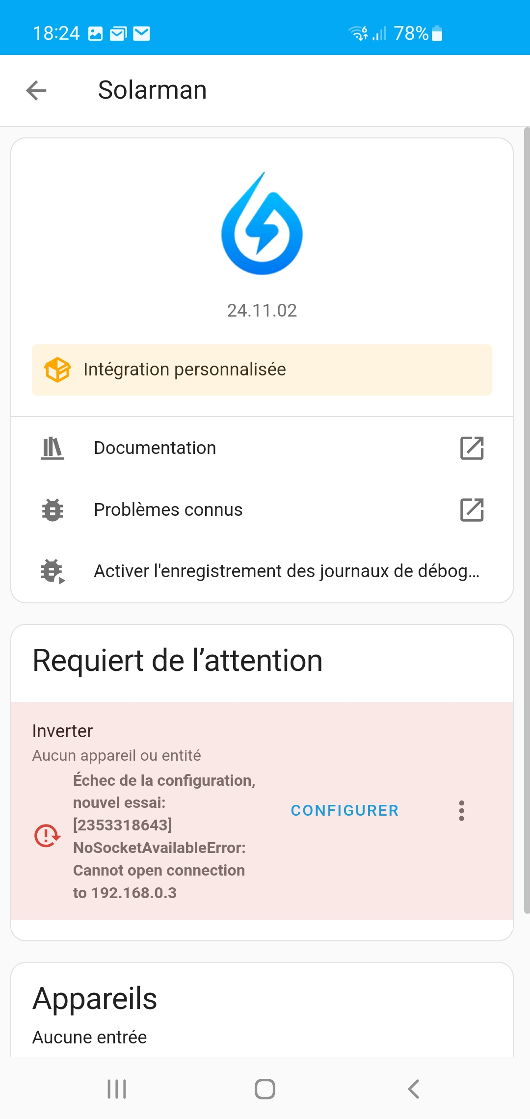 2 - piste à explorer : l’intégration SOLARMAN de Joubert dans HACS qui apparemment réclame l’IP de la connexion et le n° d’identification du dongle WIFI, donc il s’adresse au dongle. L’auteur a généré quelques fichiers de paramétrage pour onduleur DEYE ou SOFAR mais je n’y trouve pas le mien et je remonte 51 capteurs « inconnu ».