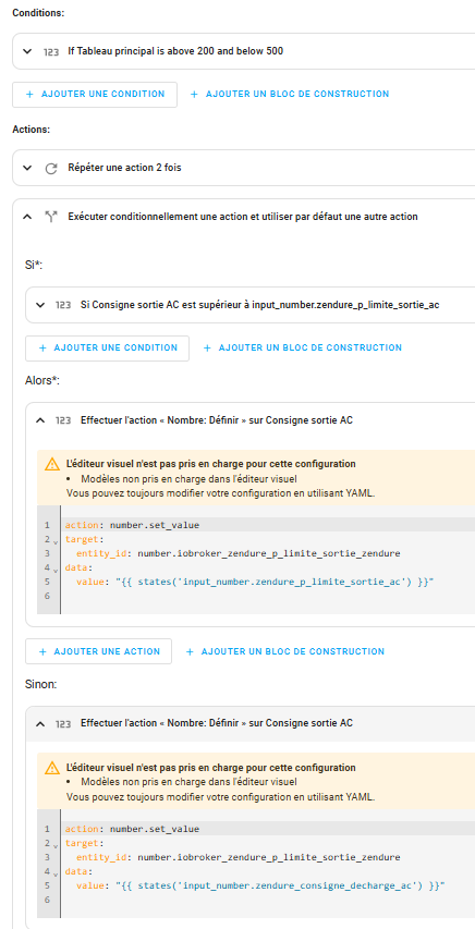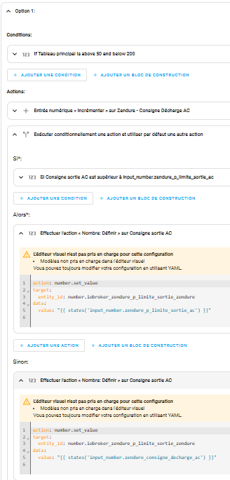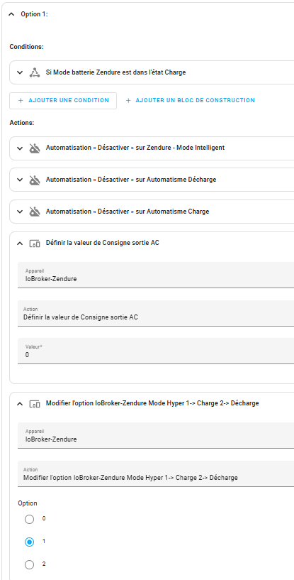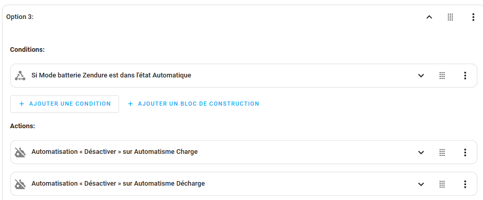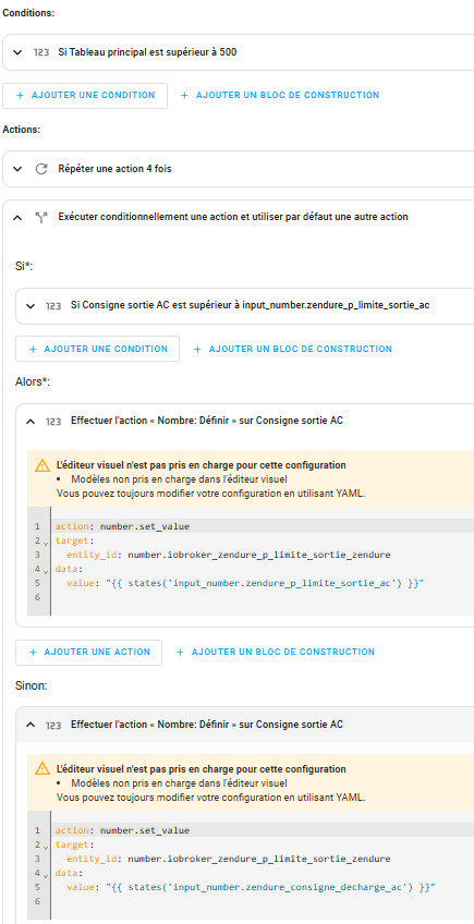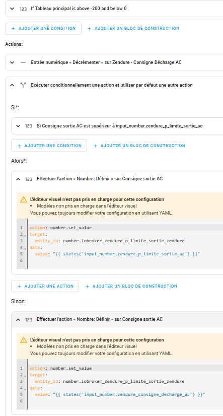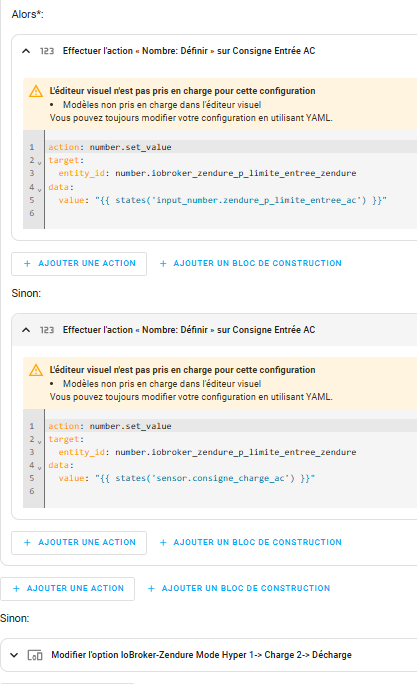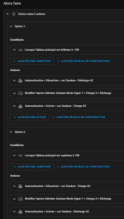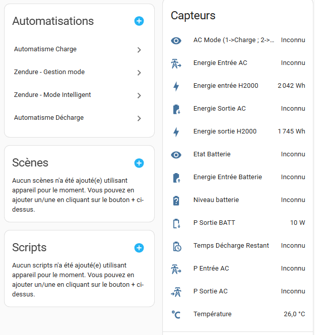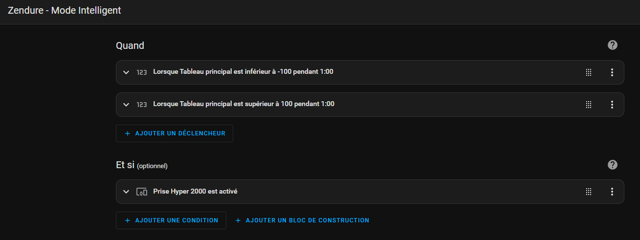 Voilà c’est une manière (parmi tant d’autres certainement) de recréer un mode intelligent dans HA. Ensuite vous pourrez facilement jongler entre les différents mode suivant vos plannings, charger la nuit si besoin la veille d’un jour tempo, géré les priorités avec un autre équipement tel qu’un routeur, bref les possibilités sont grandes et vont bien au delà de ce que propose aujourd’hui l’appli Zendure.