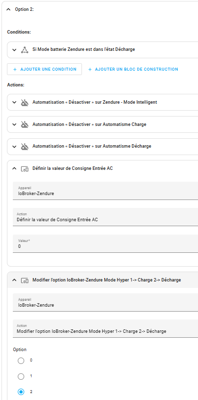 Choix 2 : mode « Décharge » qui désactive tous les automatismes et envoie des requêtes MQTT pour activer la décharge de l’hyper (AC mode = 2) en ayant préalablement remis à 0 la consigne de charge