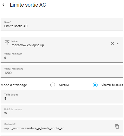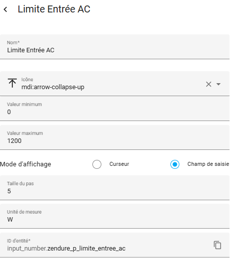 J’ai également créé une entrée « limite de charge » pour brider la charge à une valeur max si nécessaire :