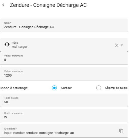 Pour l’automatisation de décharge, j’ai tout d’abord créé une entrée « Consigne décharge AC » qui me permet de définir la puissance de décharge par pas de 50W :