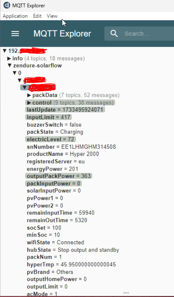 C’est le moment de vérifier dans MQTT explorer que notre MQTT Zendure diffuse bien les informations :