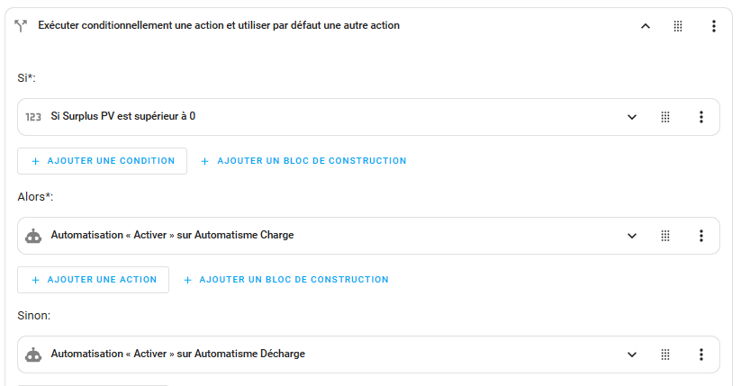 - enfin réactive le mode « Charge » ou « décharge » en fonction de la valeur du surplus (charge si surplus >0, décharge si surplus=0) lorsque le mode automatique est sélectionné.
