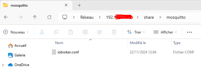 Tout d’abord il va falloir créer un fichier « iobroker.conf » dans le répertoire share/mosquitto de votre HA :