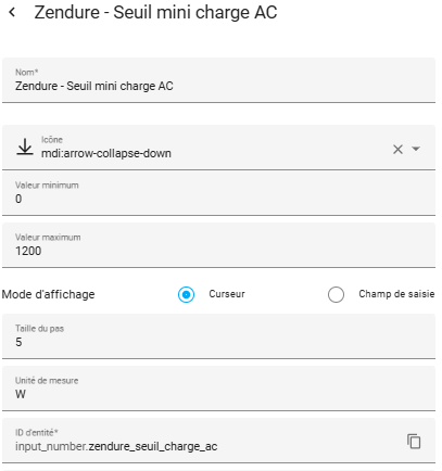 Pour l’automatisation de recharge, j’ai tout d’abord créé une entrée « Seuil mini charge AC » qui me permet de définir le seuil de surplus à partir duquel la batterie va charger :