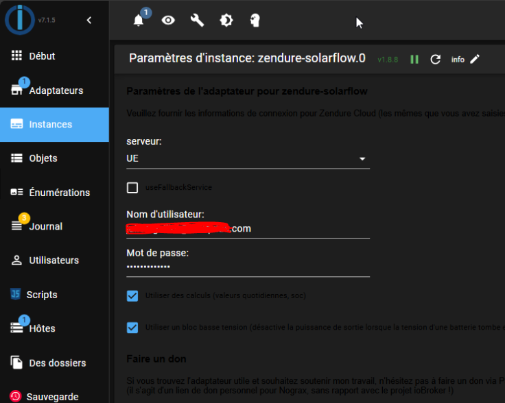 ATTENTION : Dés que ioBroker sera connecté à votre compte Zendure, l’application de votre téléphone sera automatiquement déconnectée. Pour garder le contrôle sur l’application Zendure avec votre smartphone, il faudra créer un partage d’appareil avec un second compte Zendure