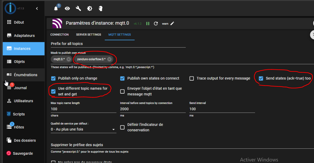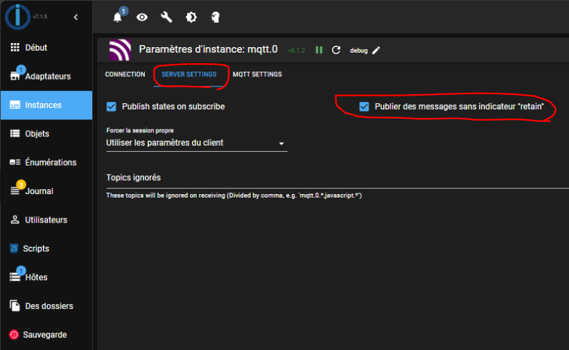 Dans l’onglet « server setting » cocher « publier sans retain » :