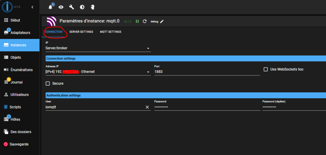 Avec le contenu suivant (à adapter avec votre IP et les username/password/clientid définis dans ioBroker) :