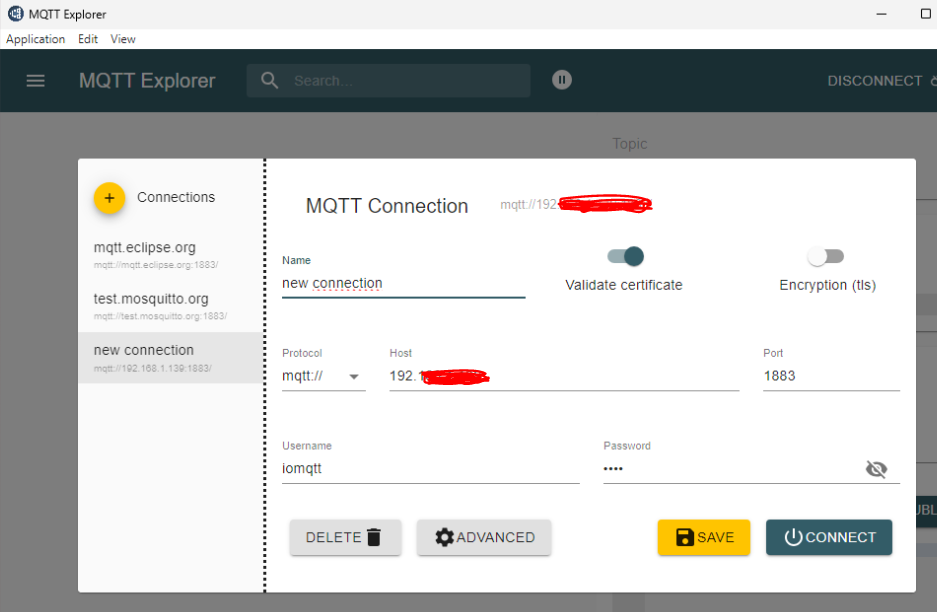 Dans l’onglet « connection » configurez votre adresse IP, un user et un mot de passe :