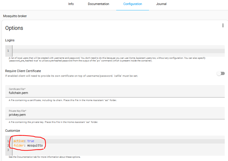 Dans la configuration du module complémentaire mosquitto broker, activer la customization à « true » pour le répertoire « mosquitto » (celui qui contient le fichier .conf) :