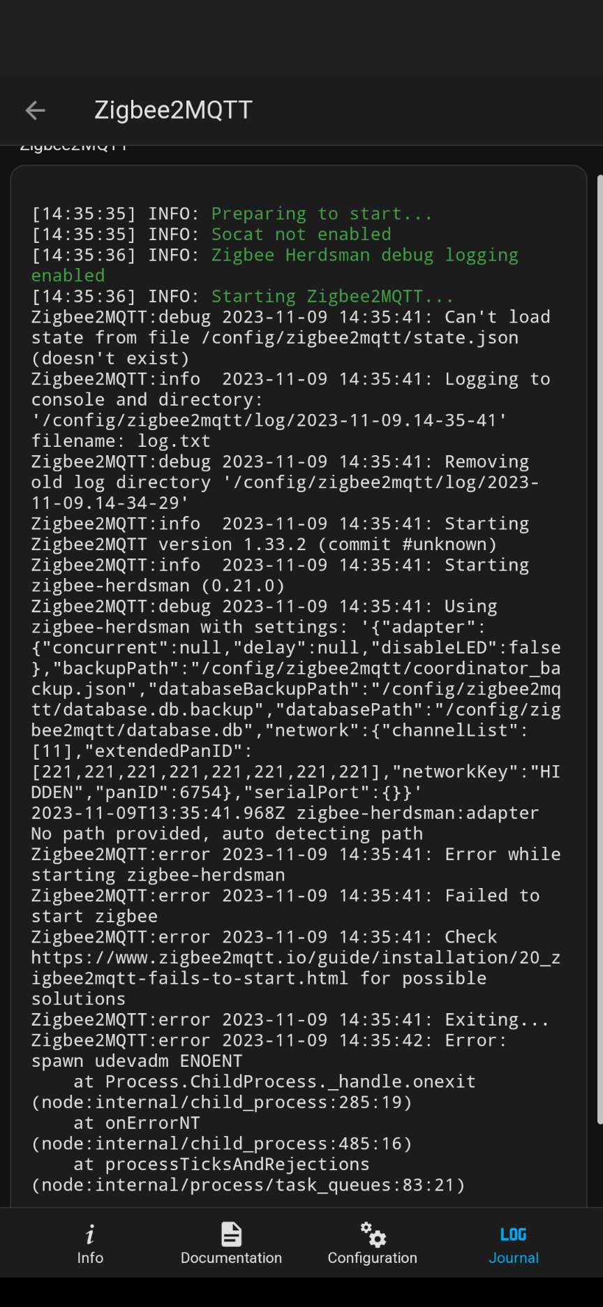 Zigbee2MQTT:error 2023-09-10 23:44:57: Error: spawn udevadm ENOENT