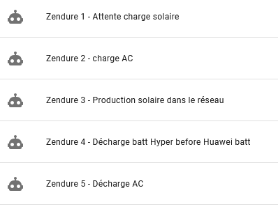 j’ai finalisé mes automatisations et j’en ai 5, dans mon cas précis (système principal Huawei 7.8wc de panneaux, onduleur hybride 6Kw et batteries 10Kw Huawei) j’ai 5 automatisations, beaucoup plus simple que les tiennes, mais ca fonctionne: