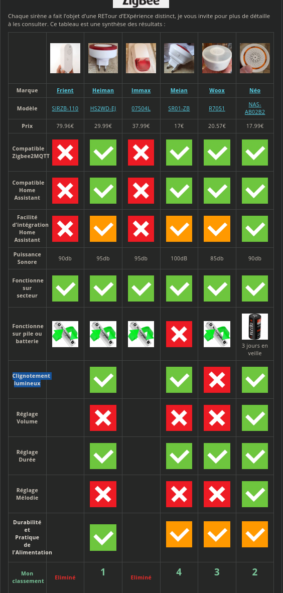Merci pour ce comparatif je suis un peu un novice avec z2mqtt et je n’arrivais pas à faire fonctionner la sirène de chez Meian mais grâce à votre comparatif c’était réglé en deux secondes.