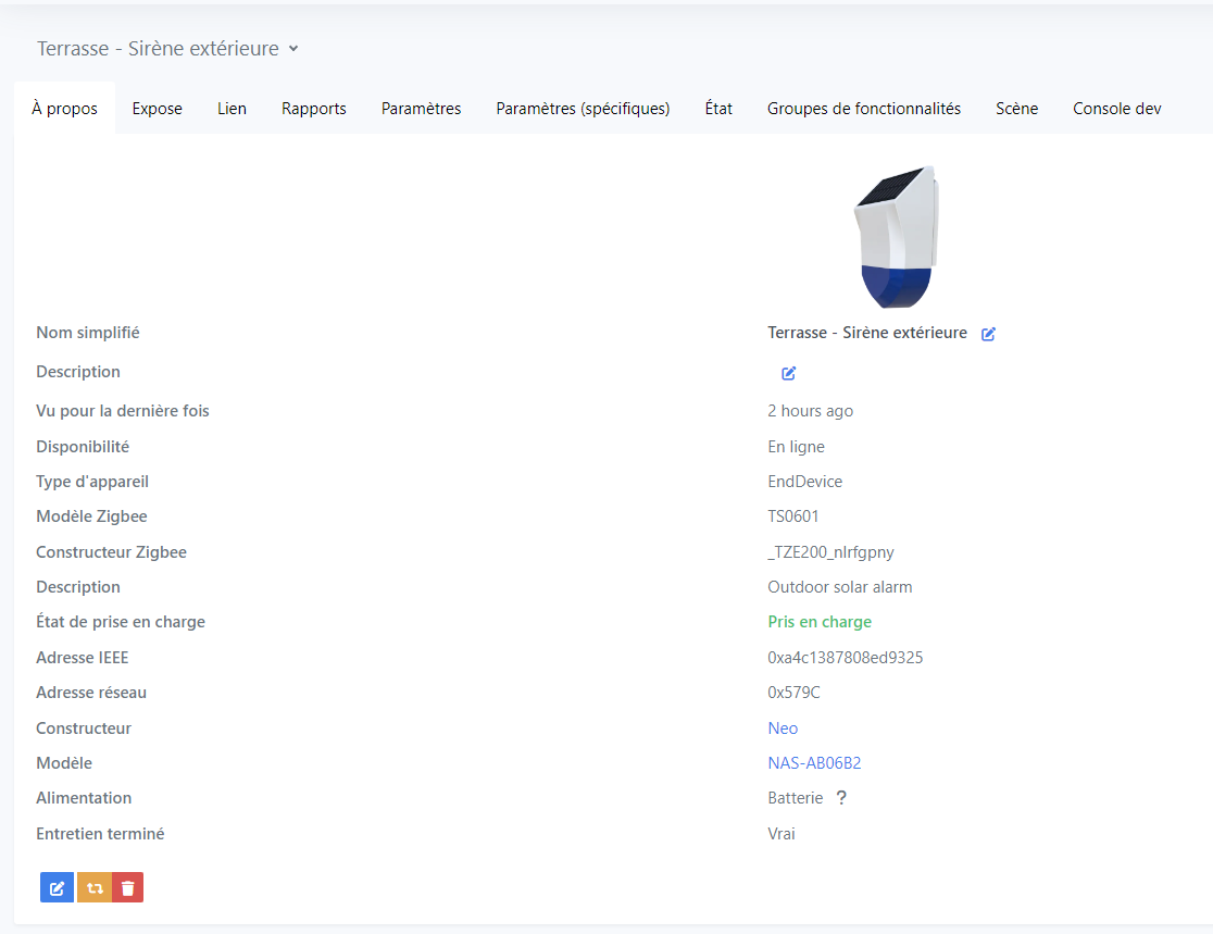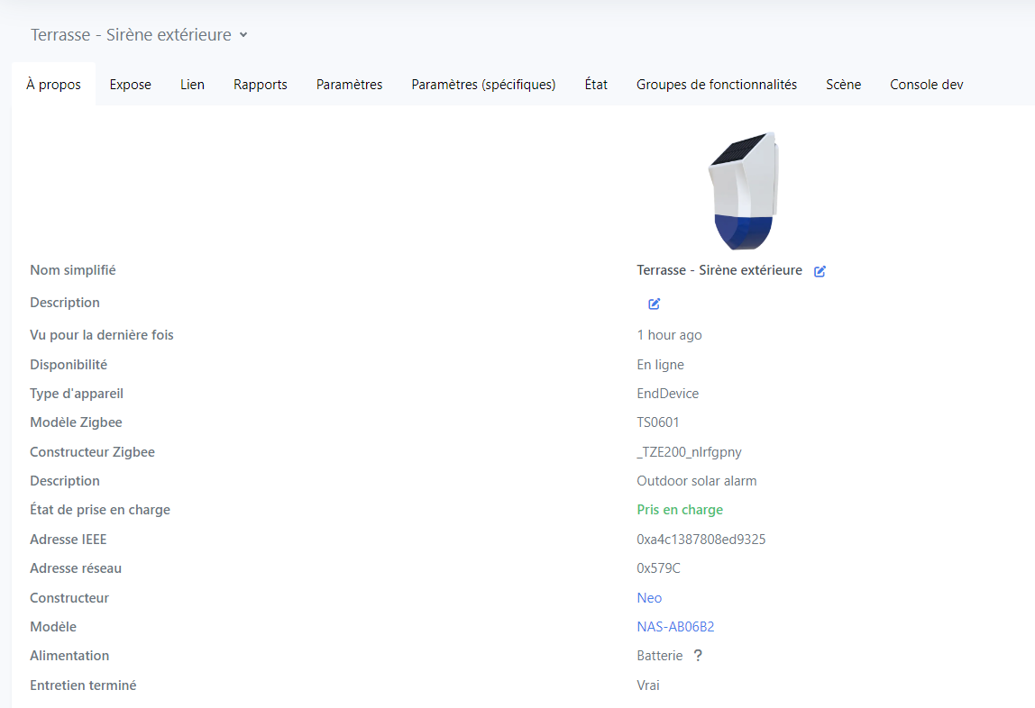 Pour cette alarme, toujours pas de retour de l’état de la batterie (rechargeable par le panneau solaire ou par USB). Pas de convertisseur externe qui permette à ce jour d’avoir ce retour d’état.