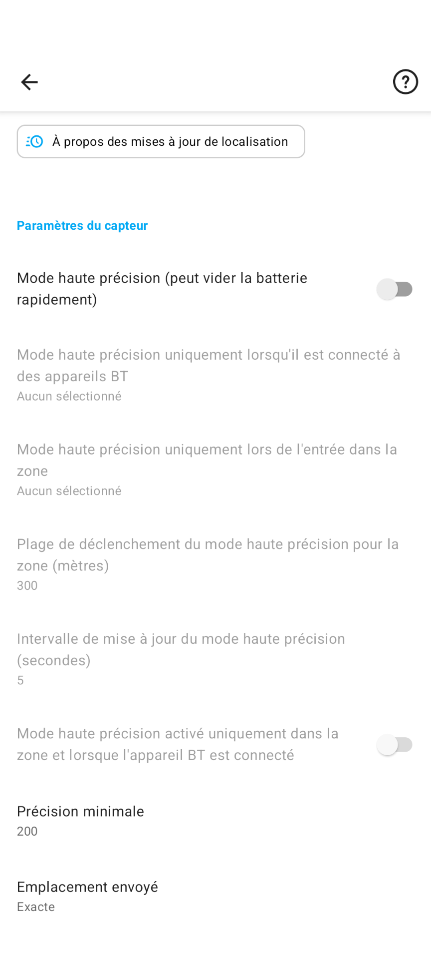 Tu peux aussi inclure le capteur emplacement précis unique dans la mise a jour des capteurs. Tu actives aussi le capteurs adresse ip publique et type de connexion. Ainsi ton emplacement sera maj quand ton téléphone changera de reseau et se connectera au wifi chez toi.